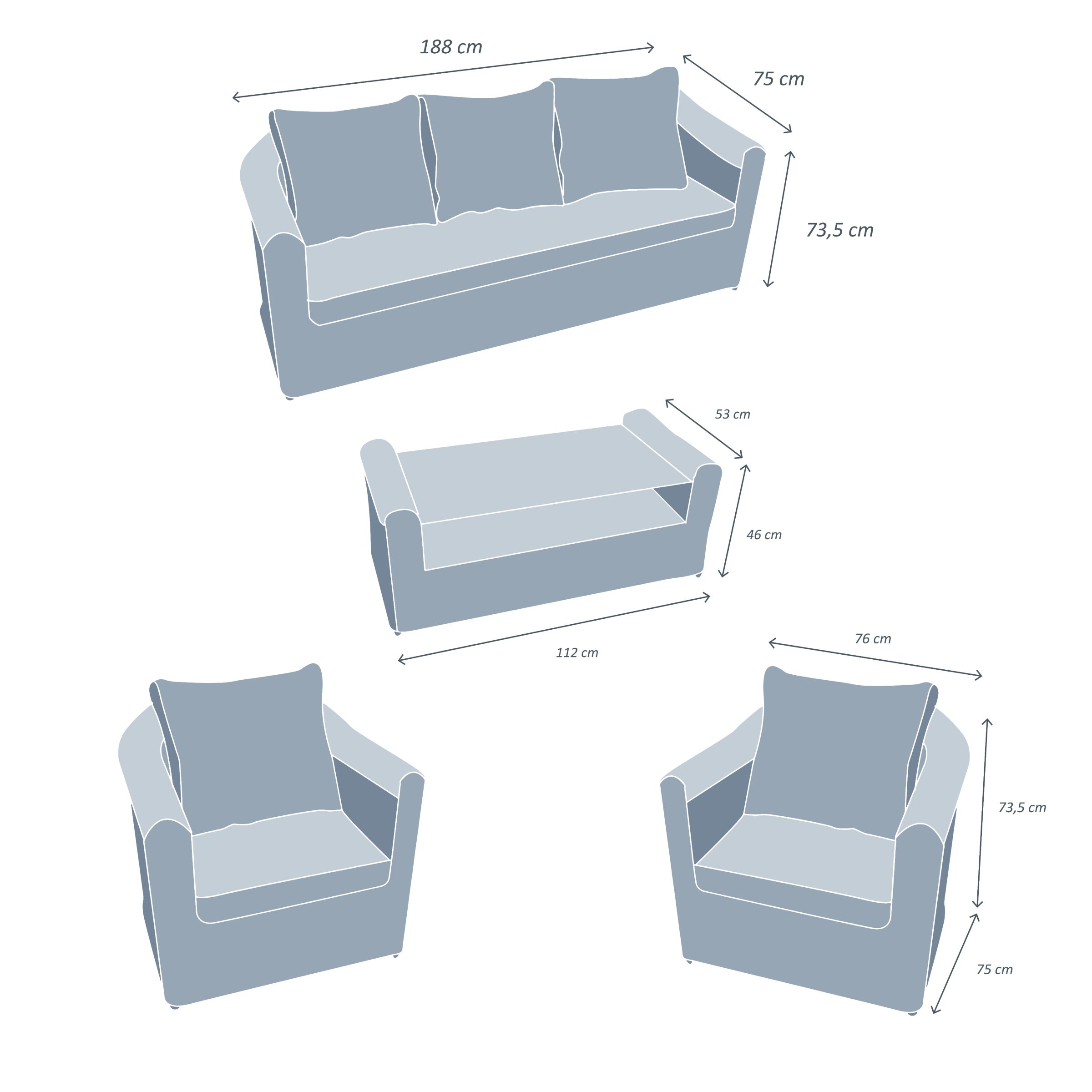 Medidas : - Sillón con reposabrazos : largo 77 cm x profundidad 75 cm x alto 75 cm. - Sofá de 3 plazas : largo 189 cm x profundidad 75 cm x alto 75 cm. - Mesa de centro : largo 112 cm x profundidad 53 cm x alto 48 cm. - Altura del asiento : 40 cm con cojín y 30 sin cojín. - Altura del respaldo desde el asiento : 23 cm. - Altura del reposabrazos : 63 cm. - Profundidad del asiento : 56 cm sin cojín y aproximadamente 42 cm con cojín. - Patas : alto 2 cm. - Reposabrazos : ancho 12 cm. - Cojín de asiento para el sillón : largo 51 x ancho 57 x grosor 10 cm. - Cojín de asiento para el sofá de 2 plazas : largo 108 x ancho 57 x grosor 10 cm. - Cojín de asiento para el sofá de 3 plazas : largo 162 x ancho 57 x grosor 10 cm. - Cojines de respaldo : largo 55 x ancho 49 x alto 22 cm.