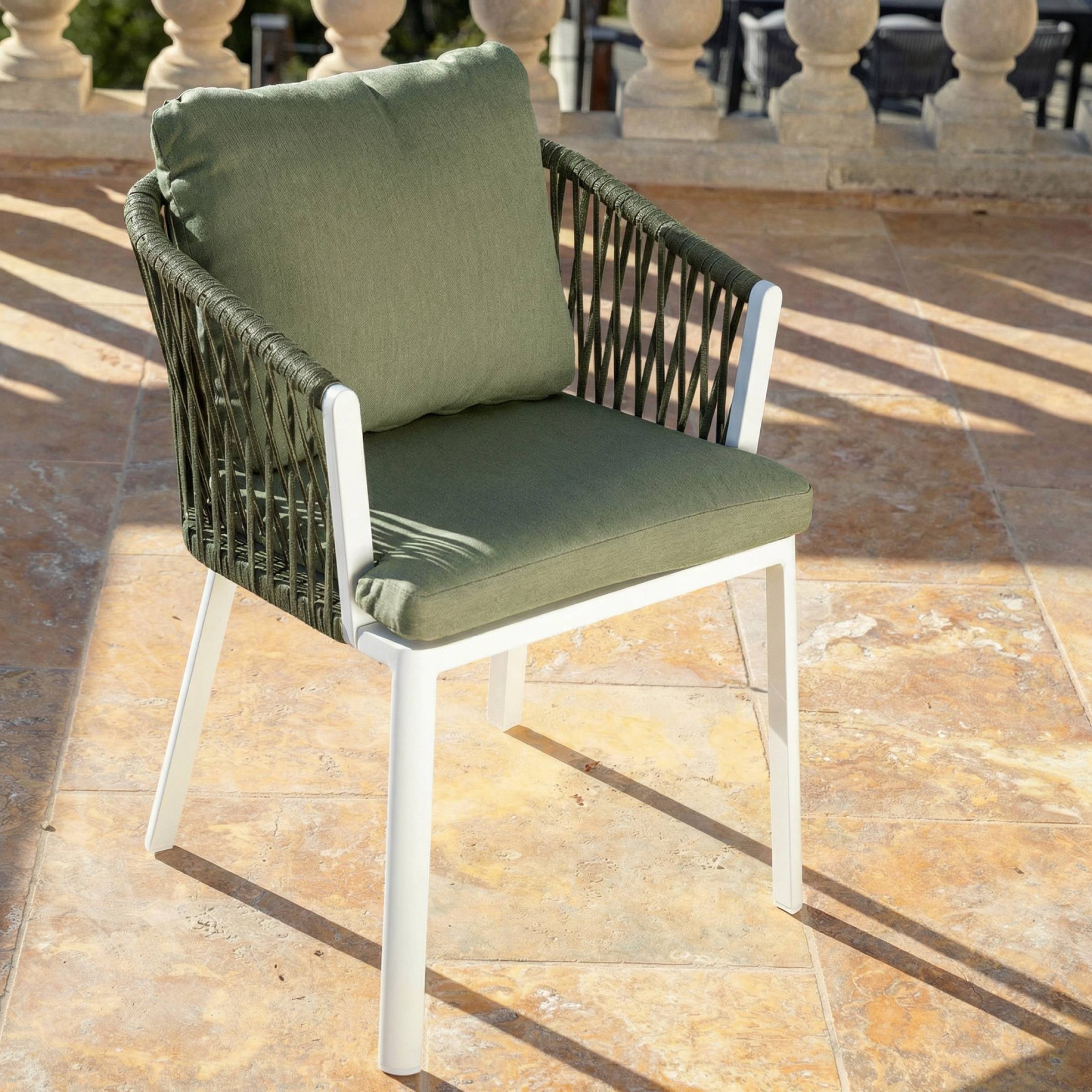 Asociadas con la mesa de jardín Amalfi, las sillas de comedor Amalfi componen un conjunto tan elegante como acogedor. Su asiento generoso y su color Verde Pino, a la vez chic y de tendencia, invitan a disfrutar plenamente de cada momento al aire libre durante todo el verano.