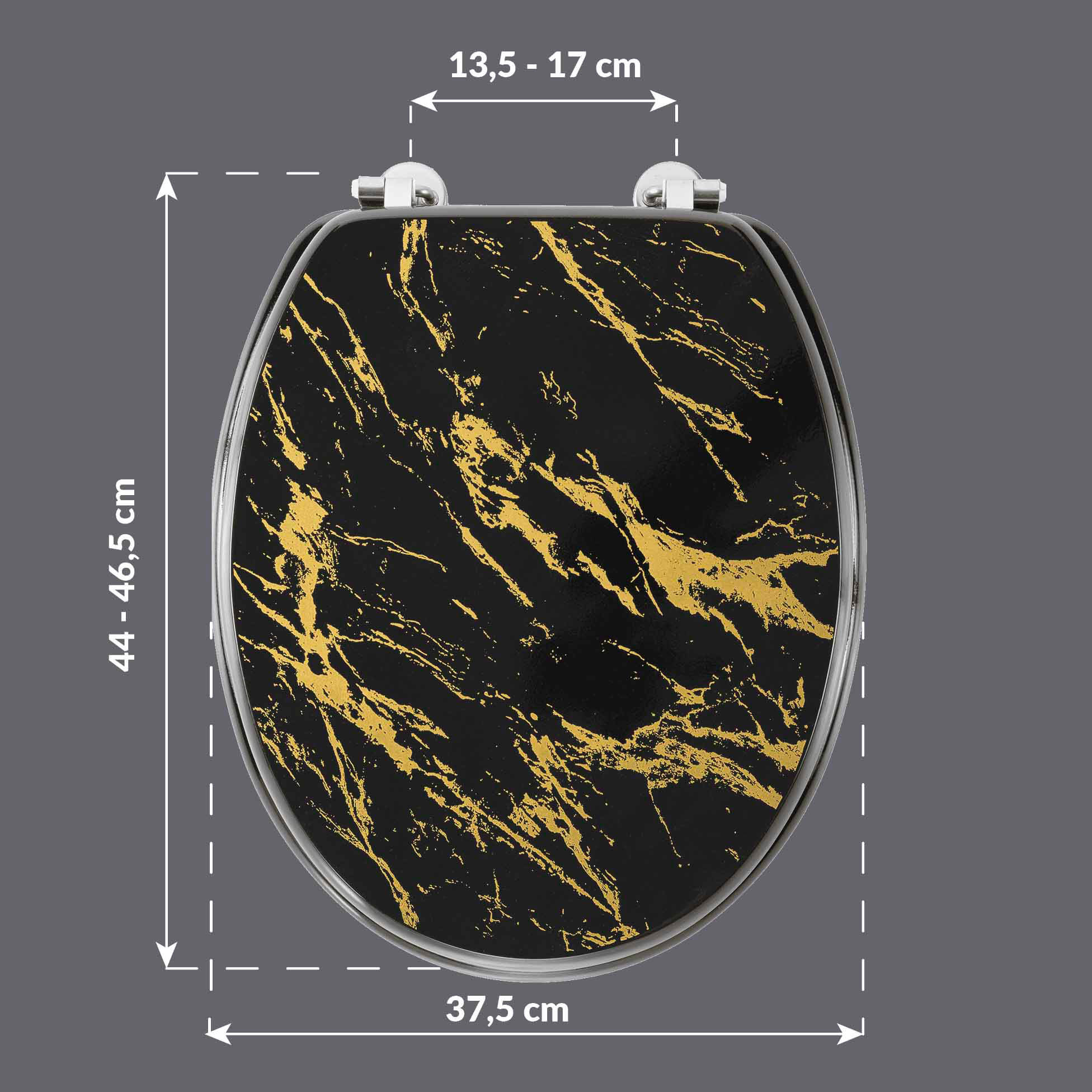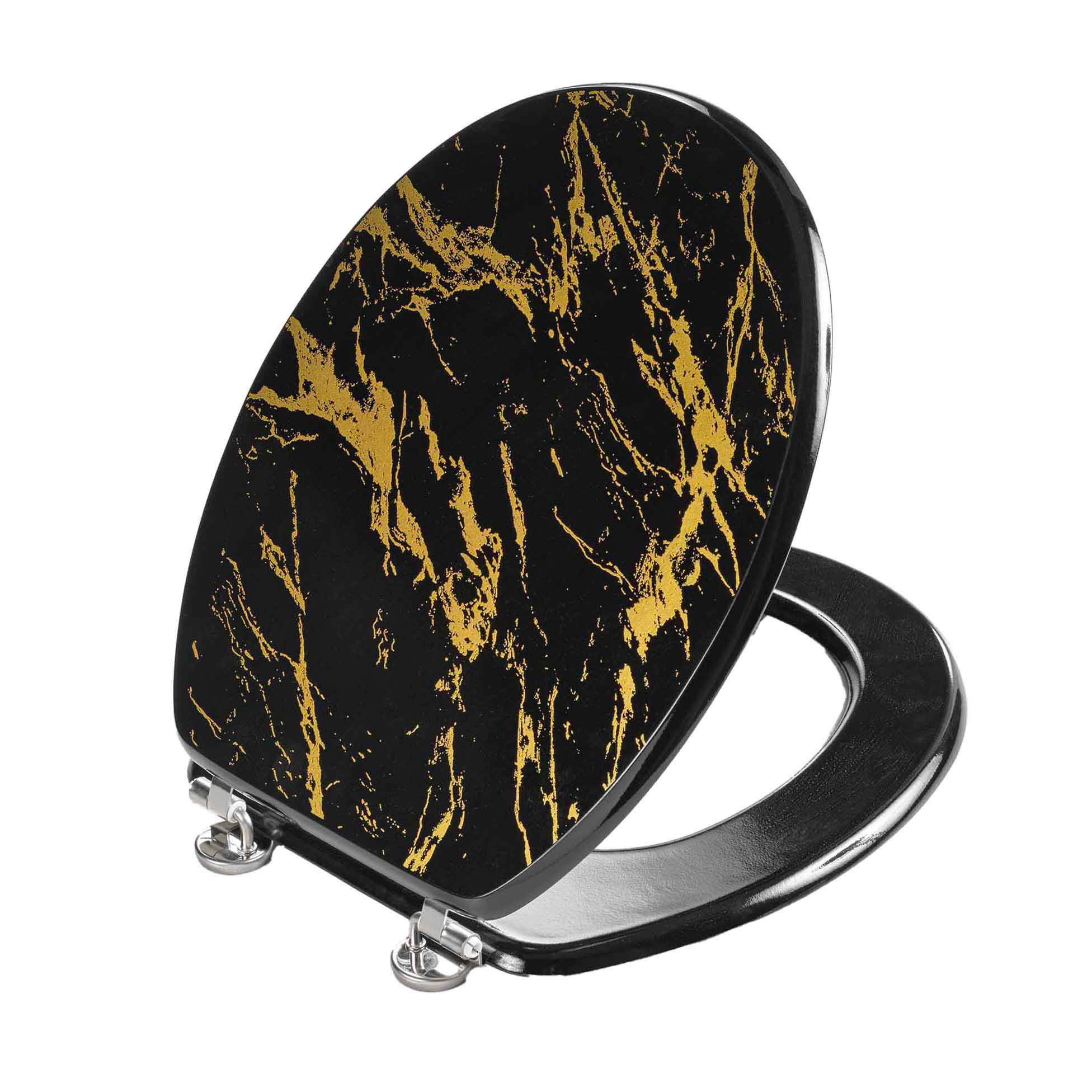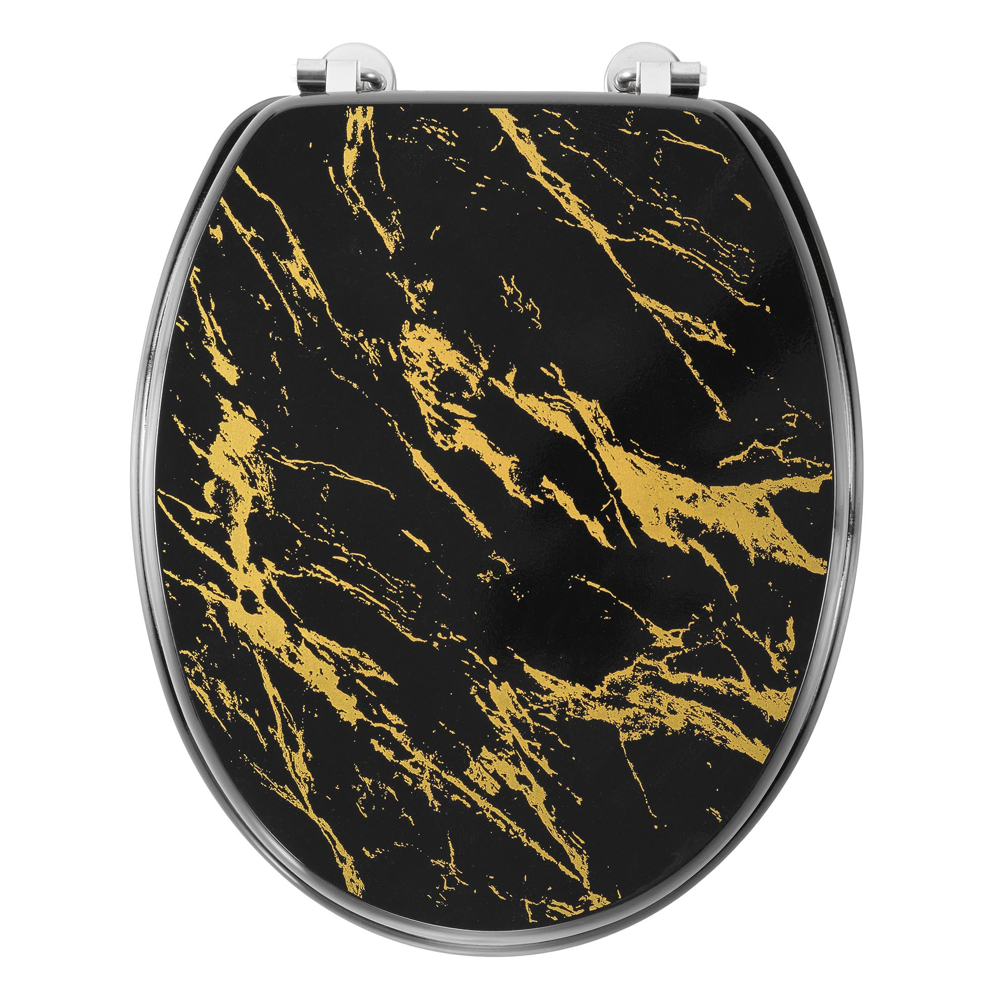 Este asiento de inodoro Aquamarbre en MDF negro, con su diseño de efecto mármol metalizado, transformará sus aseos en un espacio elegante y moderno. Fácil de mantener y cómodo de usar, también es robusto gracias a sus soportes de acero inoxidable.