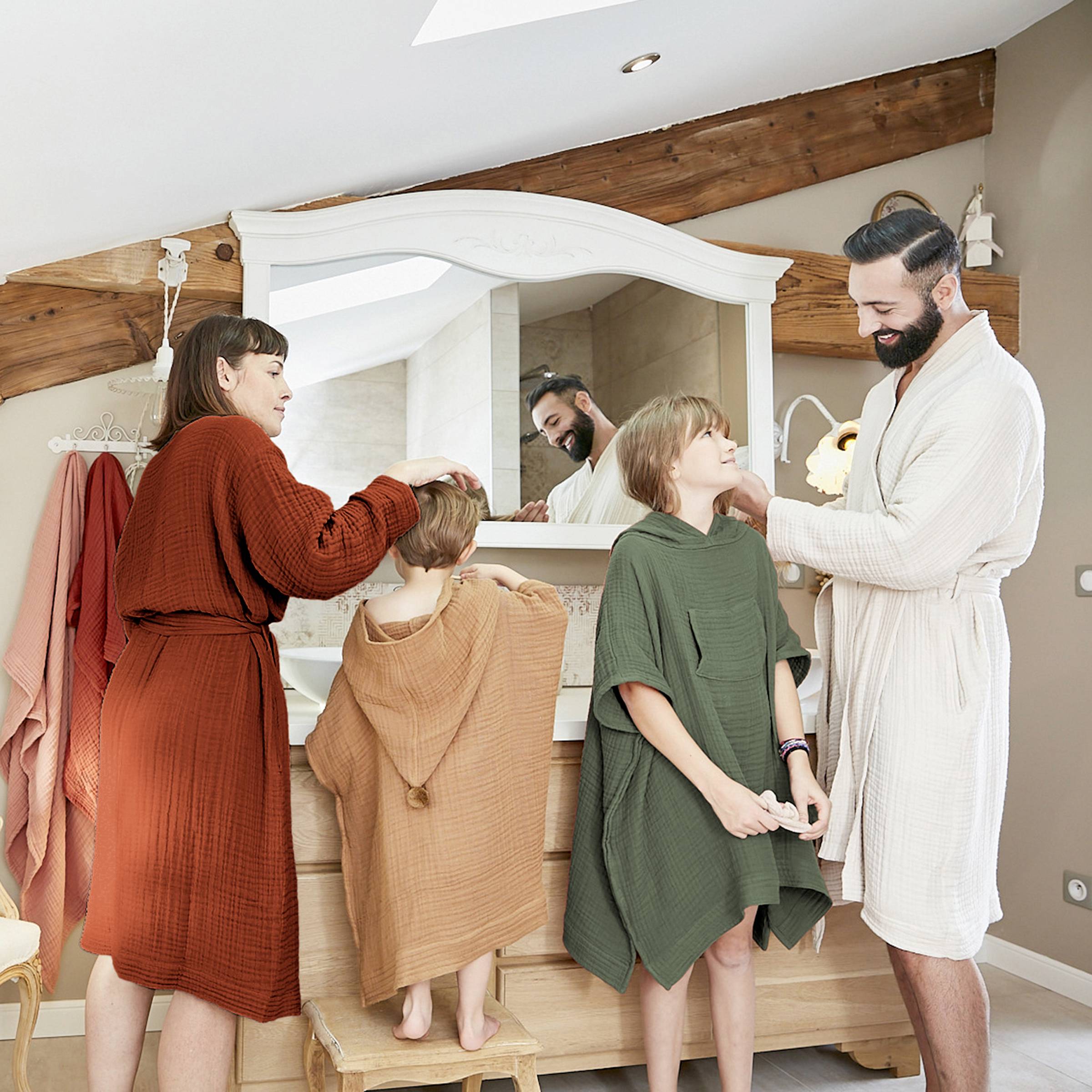 Ich würde empfehlen, den Bademantel im Zweifelsfall eine Nummer kleiner zu bestellen. Die Qualität ist sehr gut, weich und farbintensiv