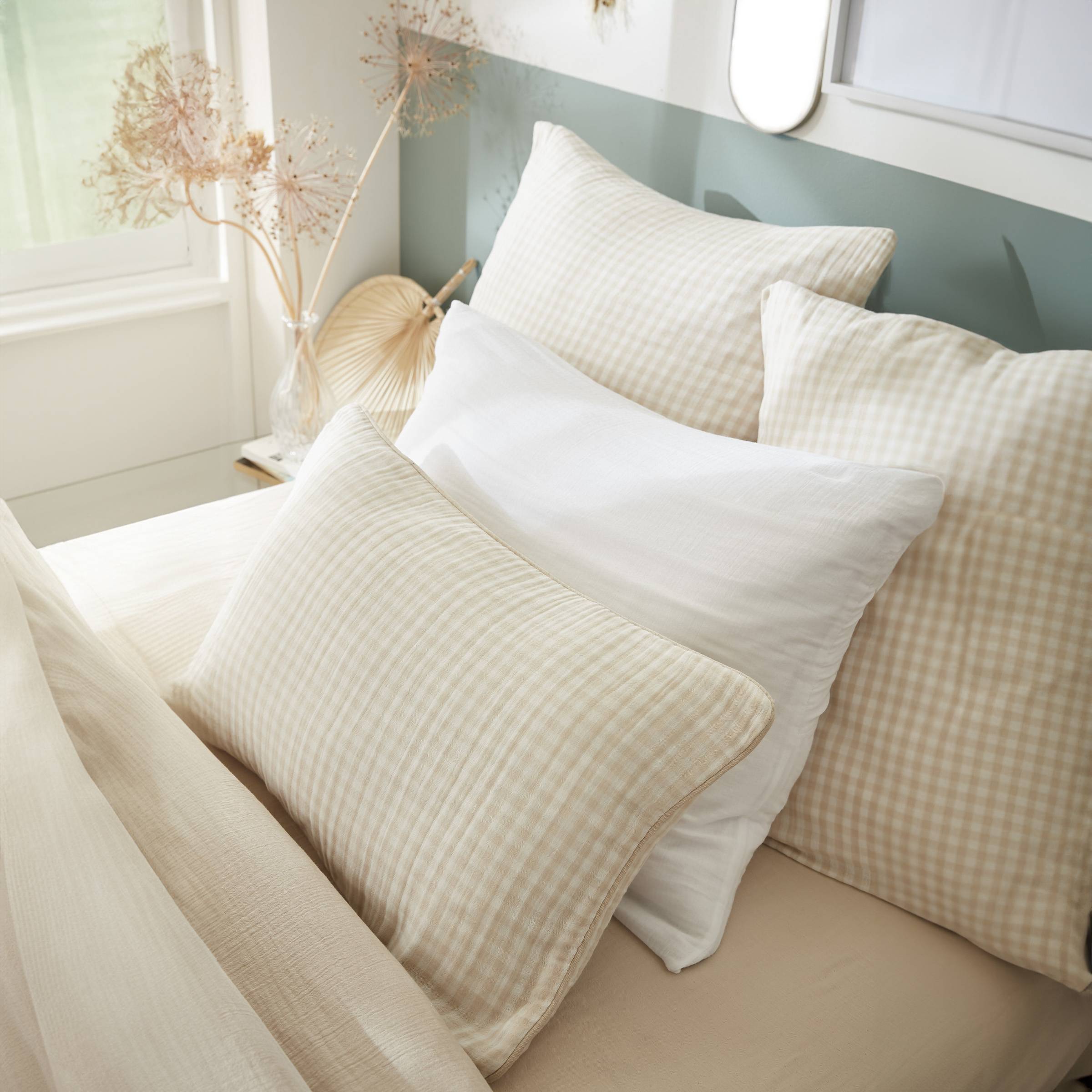 Naturalmente gofrado, este cojín de gasa de algodón no necesita planchado.