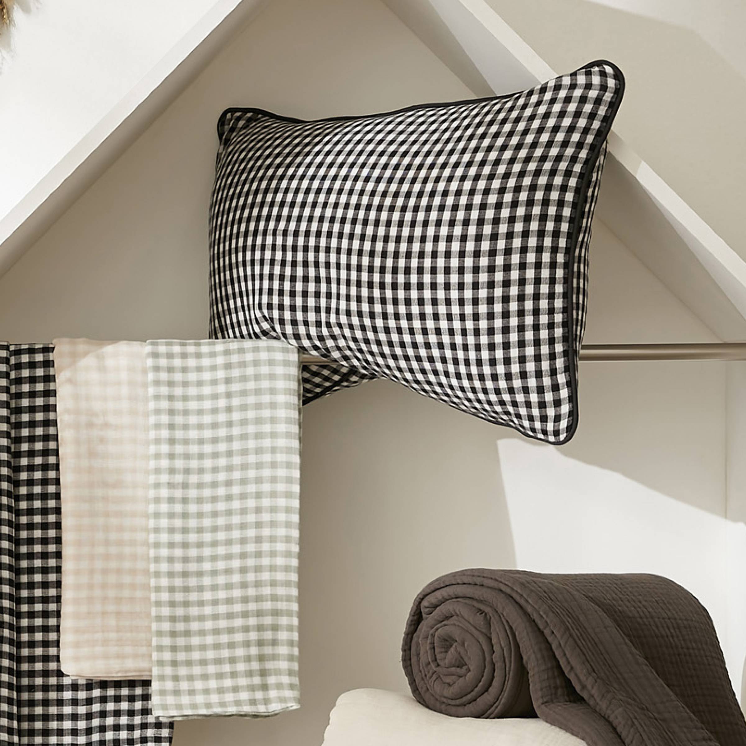 El estampado de vichy vuelve a ser el protagonista de la decoración gracias a este precioso cojín decorativo. Combinado con gasa de algodón, aporta un toque suave y natural a la decoración.