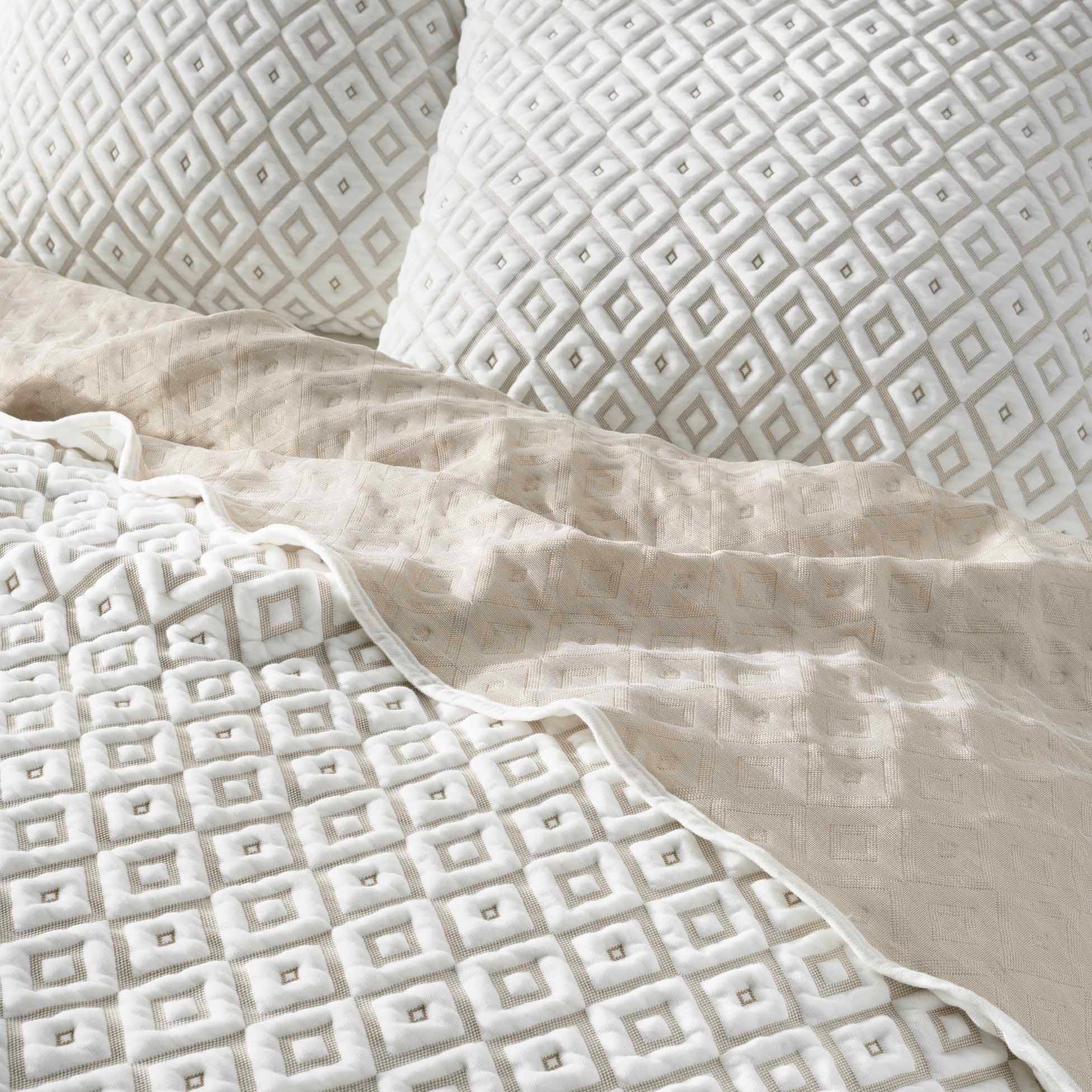Estampado : colcha con diseño gráfico en beige y blanco.