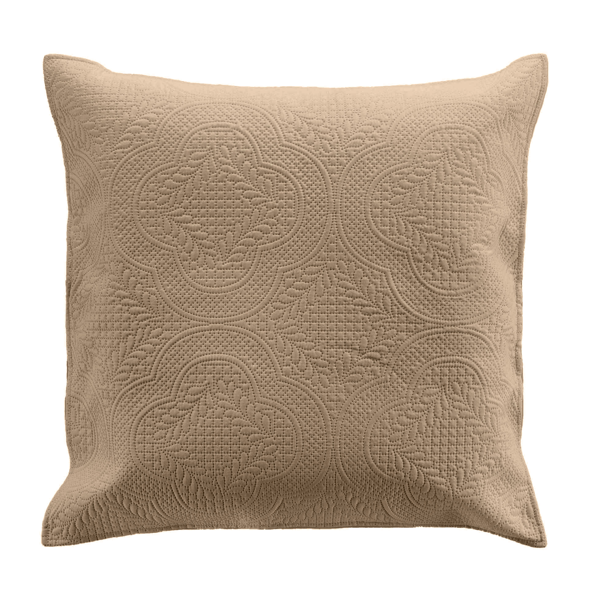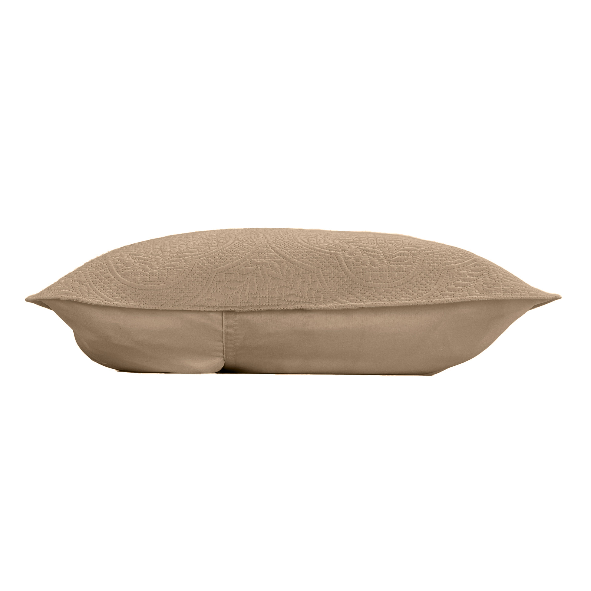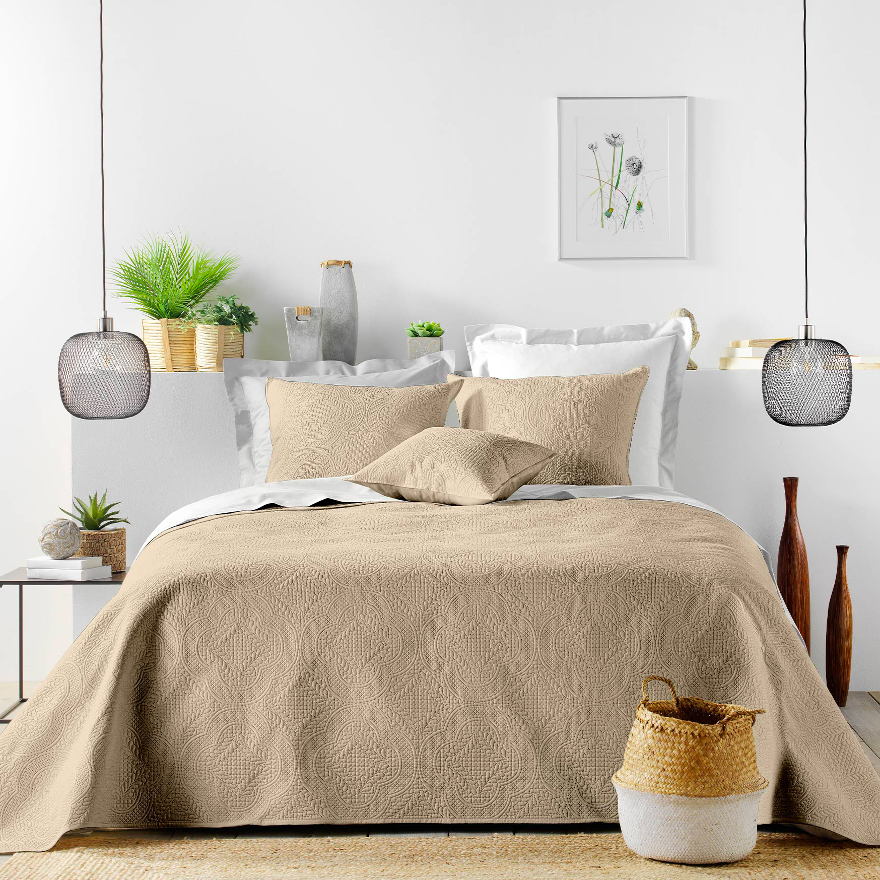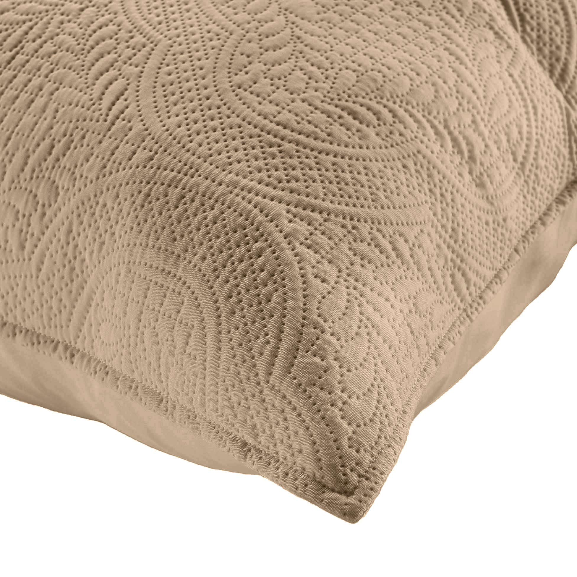 Medidas : colcha 260 x 240 cm, fundas de almohada 60 x 60 cm. Material : 100% poliéster (65gr/m²). Color : beige. Acabado : acolchado en relieve. Impreso : colcha con diseño gráfico.