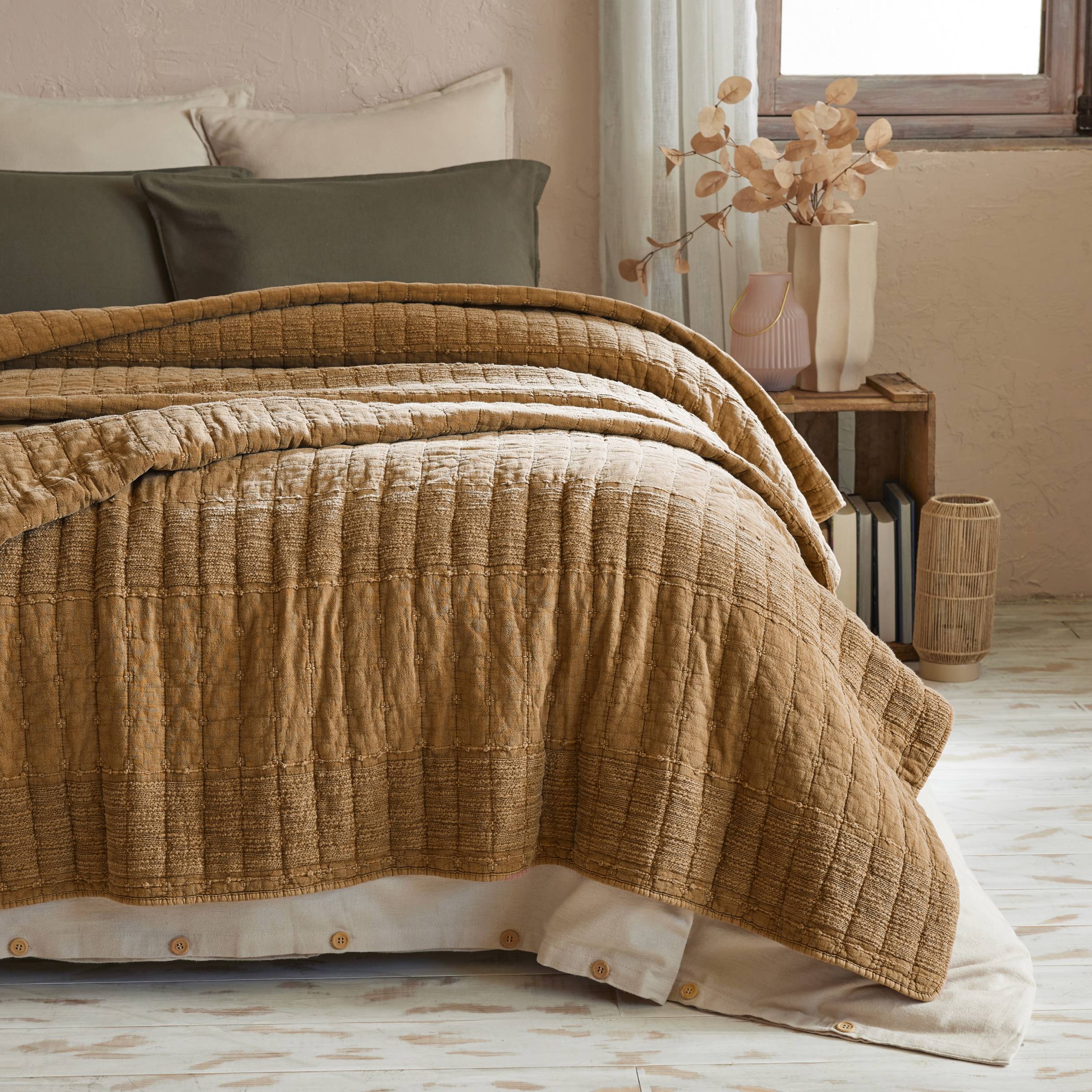La colcha acolchada Lena Camel es un verdadero capullo de suavidad. Su color camel aporta un toque cálido a tu habitación, mientras que su acolchado ofrece un confort inigualable. Ideal para noches acogedoras y merecidos momentos de relajación.