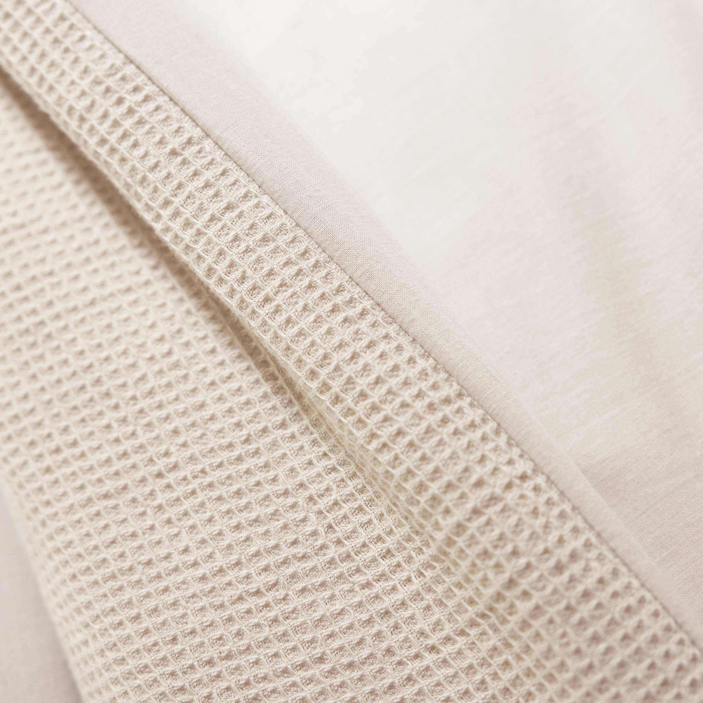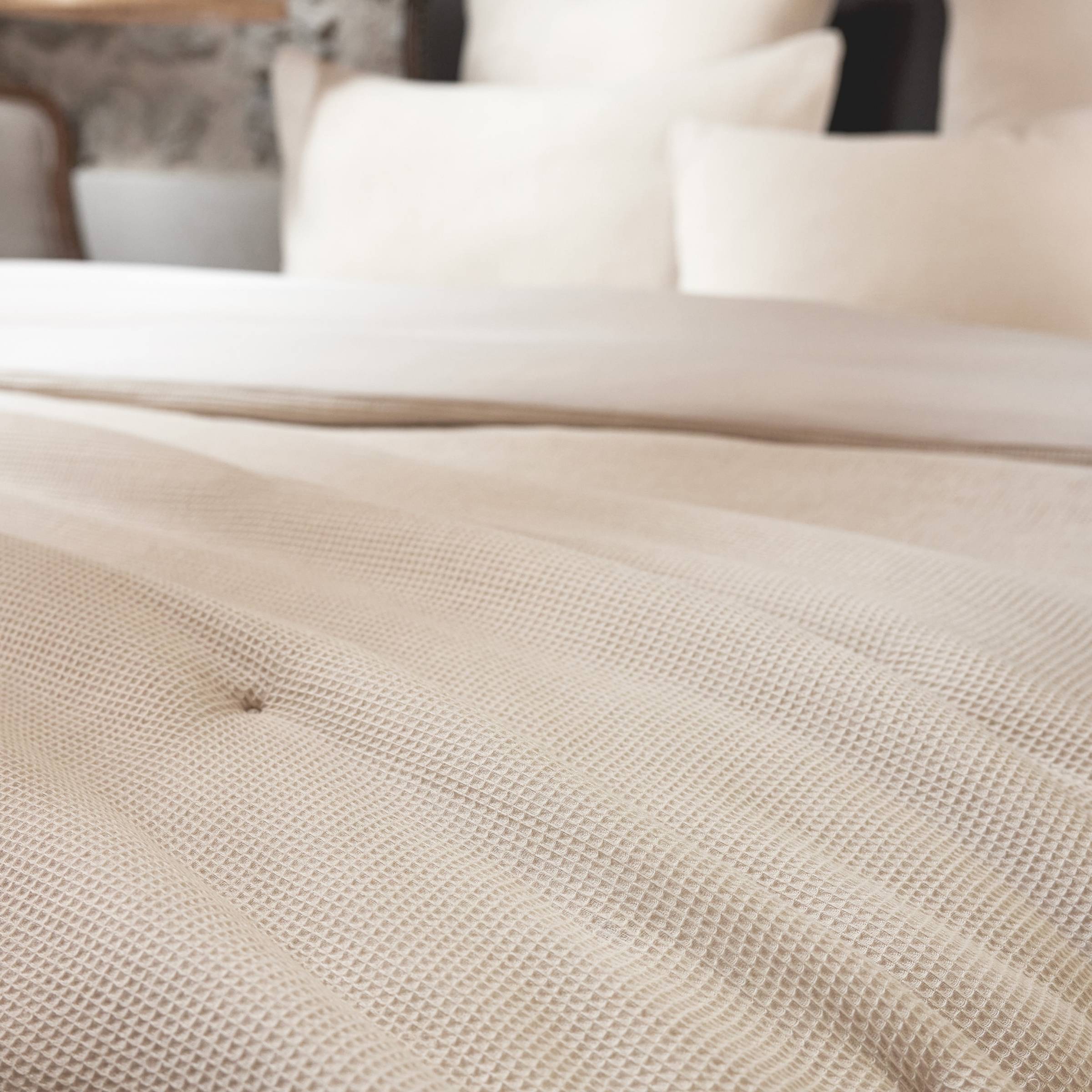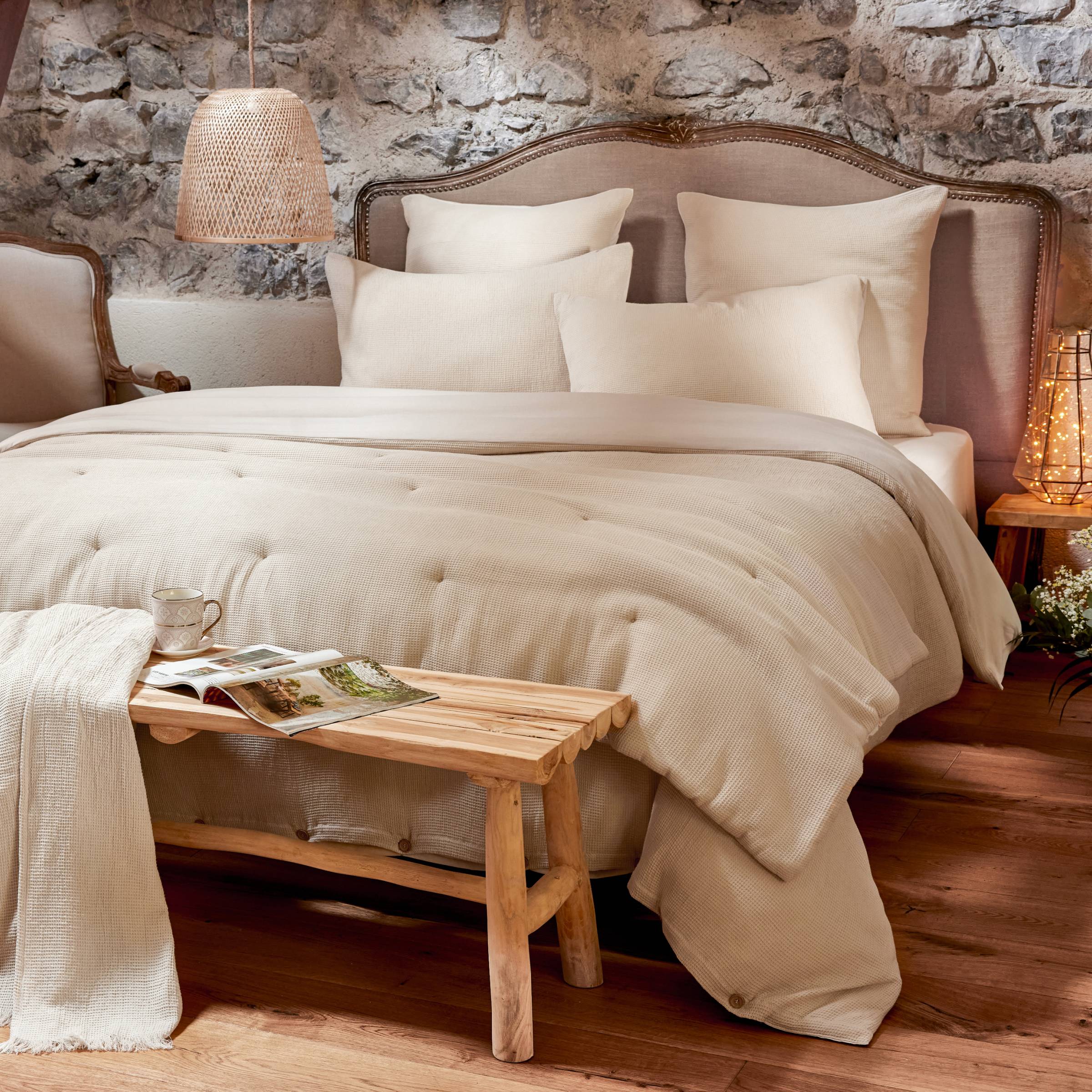 La colcha Eva de algodón beige te envuelve en suavidad para momentos de relajación inolvidables. Su diseño sencillo y su acabado de panal de abeja aportan un toque de encanto a tu habitación. Un verdadero capullo de confort para tus noches.
