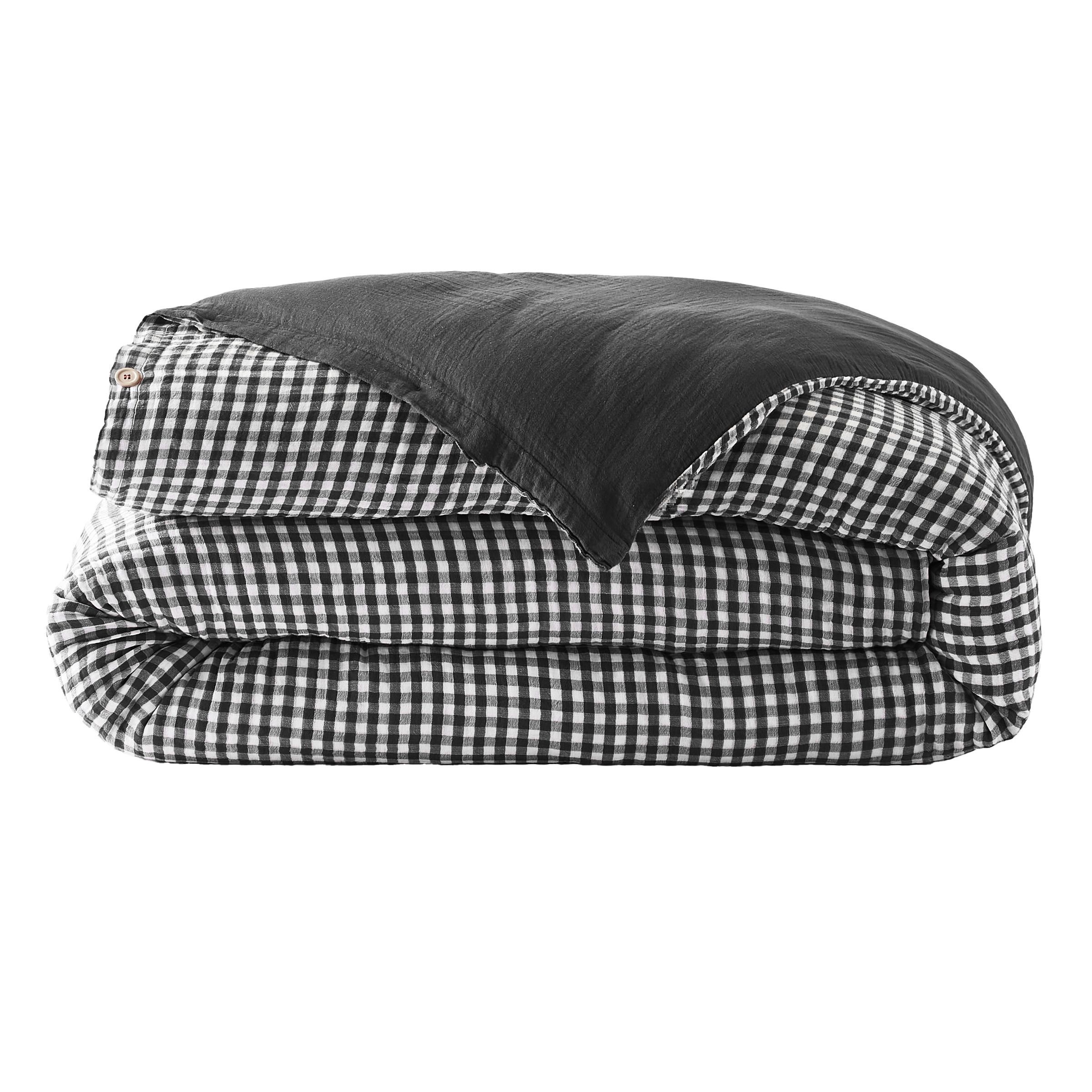 Esta funda de edredón Gaïa vichy en algodón gauze te envolverá en suavidad para noches tranquilas. Su patrón vichy negro aportará un toque gráfico a tu habitación, para un ambiente acogedor y moderno.