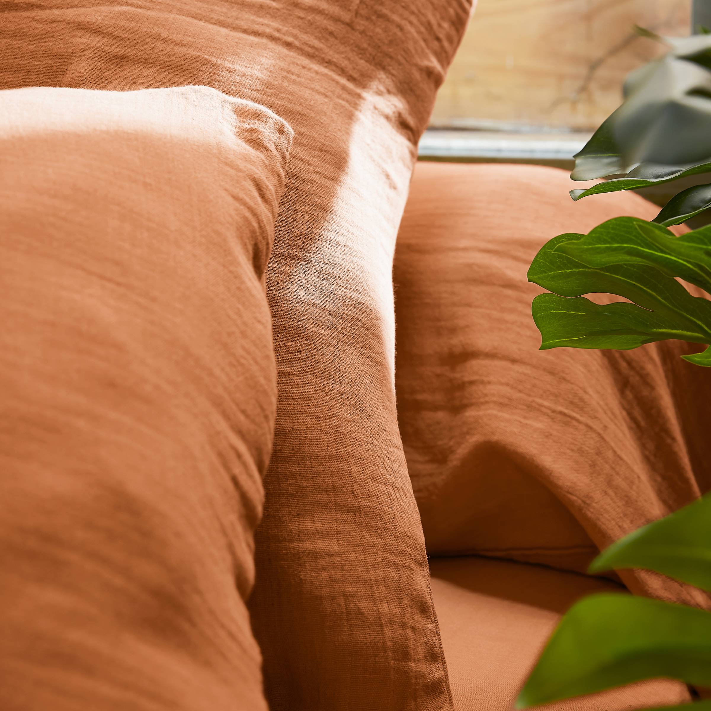 Naturalmente arrugada, esta funda de gasa de algodón no requiere planchado.