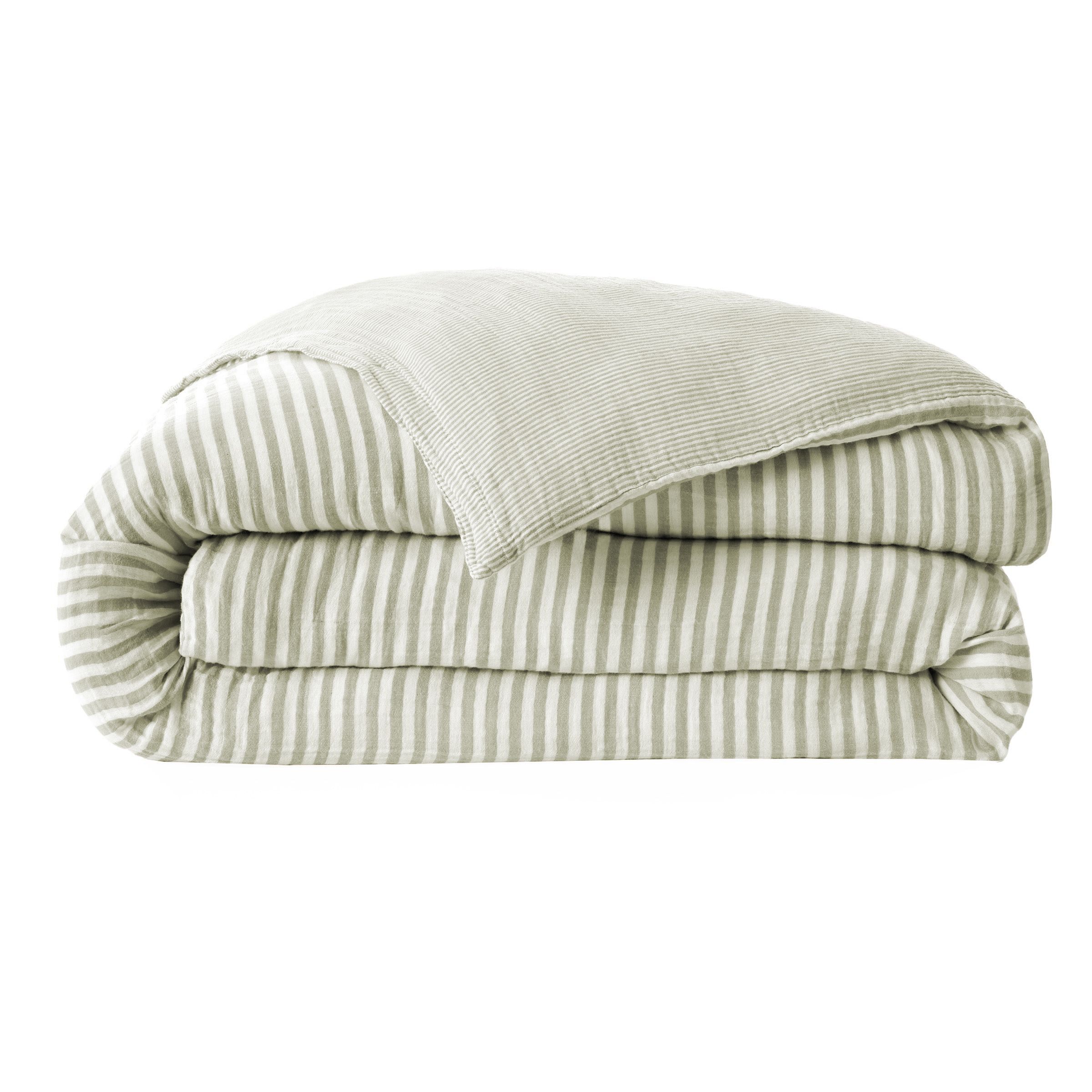 Déjate seducir por el encanto y la suavidad de la funda nórdica Gaïa rayas. Con su doble gasa de algodón y sus rayas teñidas, encajará perfectamente en tu habitación.