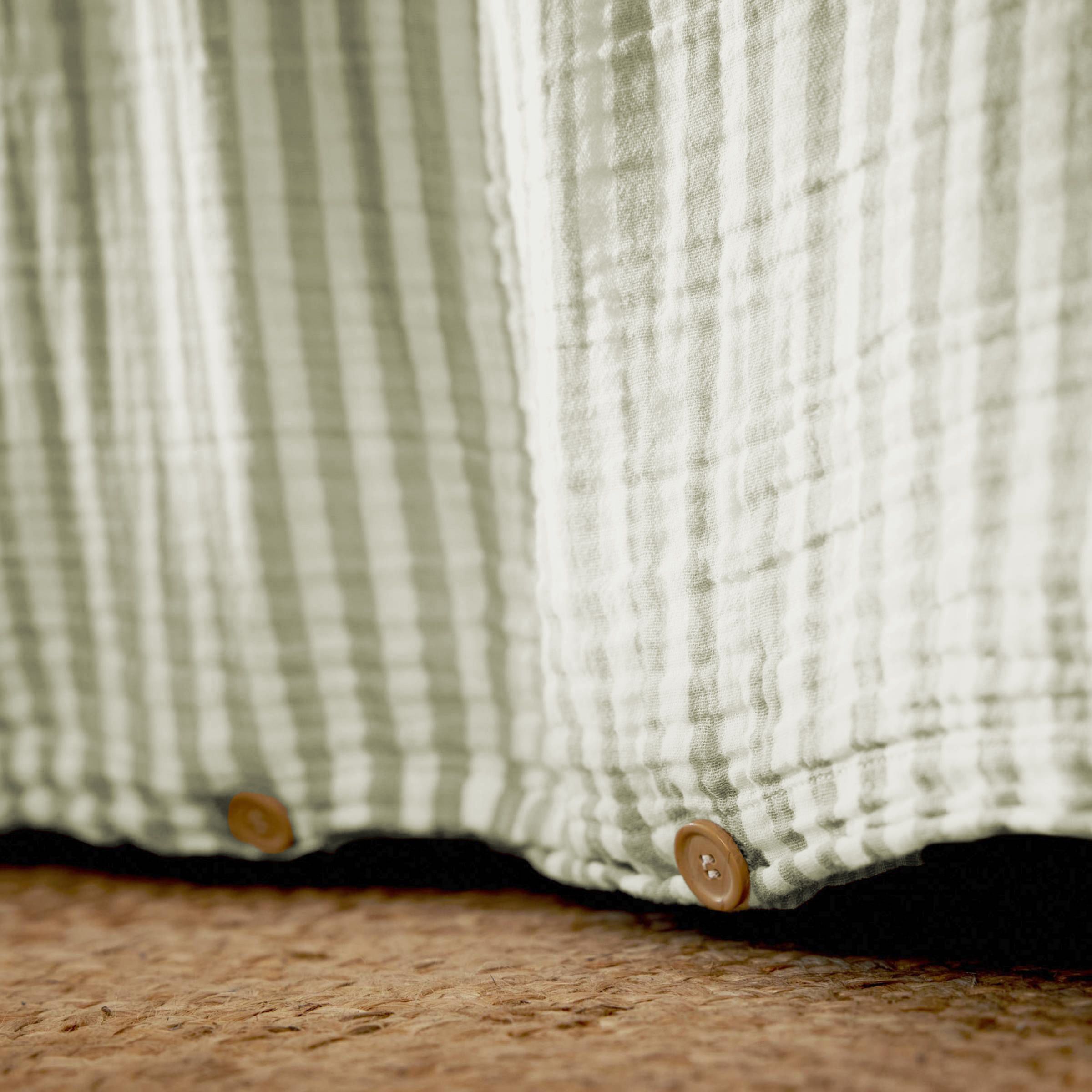 Naturalmente arrugado, la ropa de cama de gasa de algodón no necesita planchado. Para preservar el aspecto único de la gasa de algodón, te recomendamos un lavado con centrifugado moderado.